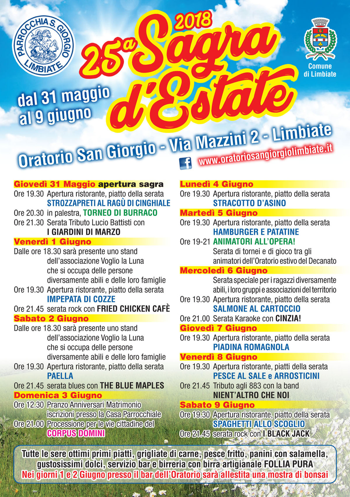 Giovedì 31 maggio all’Oratorio S.Giorgio avrà inizio la 25° edizione della Sagra d’Estate, il tradizionale evento estivo organizzato dalla Parrocchia S. Giorgio e patrocinato dal Comune di Limbiate.