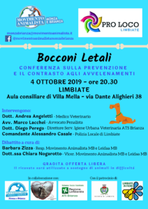 In virtù delle recenti vicende che hanno visto tentativi di avvelenamento nei confronti dei cani sul nostro territorio, l’associazione Pro Loco, col patrocinio del Comune di Limbiate, ha organizzato una conferenza sulla prevenzione e il contrasto agli avvelenamenti.