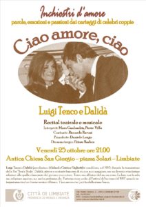 Questa volta è il turno di Luigi Tenco e Dalidà, che si conobbero nel 1965 costruendo un rapporto amoroso che portò, due anni dopo, a conseguenze “professionali” con l’esibizione al Festival di Sanremo con la celebre canzone “Ciao amore, ciao”. Per scoprire la storia del giovane cantautore italiano e della sua relazione con l’attrice e cantante francese, l’appuntamento è venerdì 25 ottobre 2019, alle ore 21.00, presso l’Antica Chiesa di San Giorgio in piazza Solari.