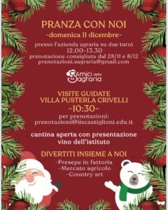 L’iniziativa, organizzata da Associazione Amici della Sagraria e I.I.S. Castiglioni con il patrocinio del Comune di Limbiate, prevede un programma di iniziative ricchissimo: dal presepe nel bosco al mercato agricolo e la vendita delle stelle di natale, passando per la country art, le visite guidate a Villa Crivelli-Pusterla e, dulcis in fundo, la presentazione del vino dell’istituto agrario. Per godere a pieno dell’atmosfera festosa sarà possibile anche pranzare in azienda.