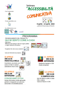 - Giovedì 11 Aprile. Sottoteatro (via Valsugana 1) ore 17:00: Spettacolo teatrale in CAA dedicato ai bambini. Uno spettacolo coinvolgente ed inclusivo con proiezione di simboli in CAA.